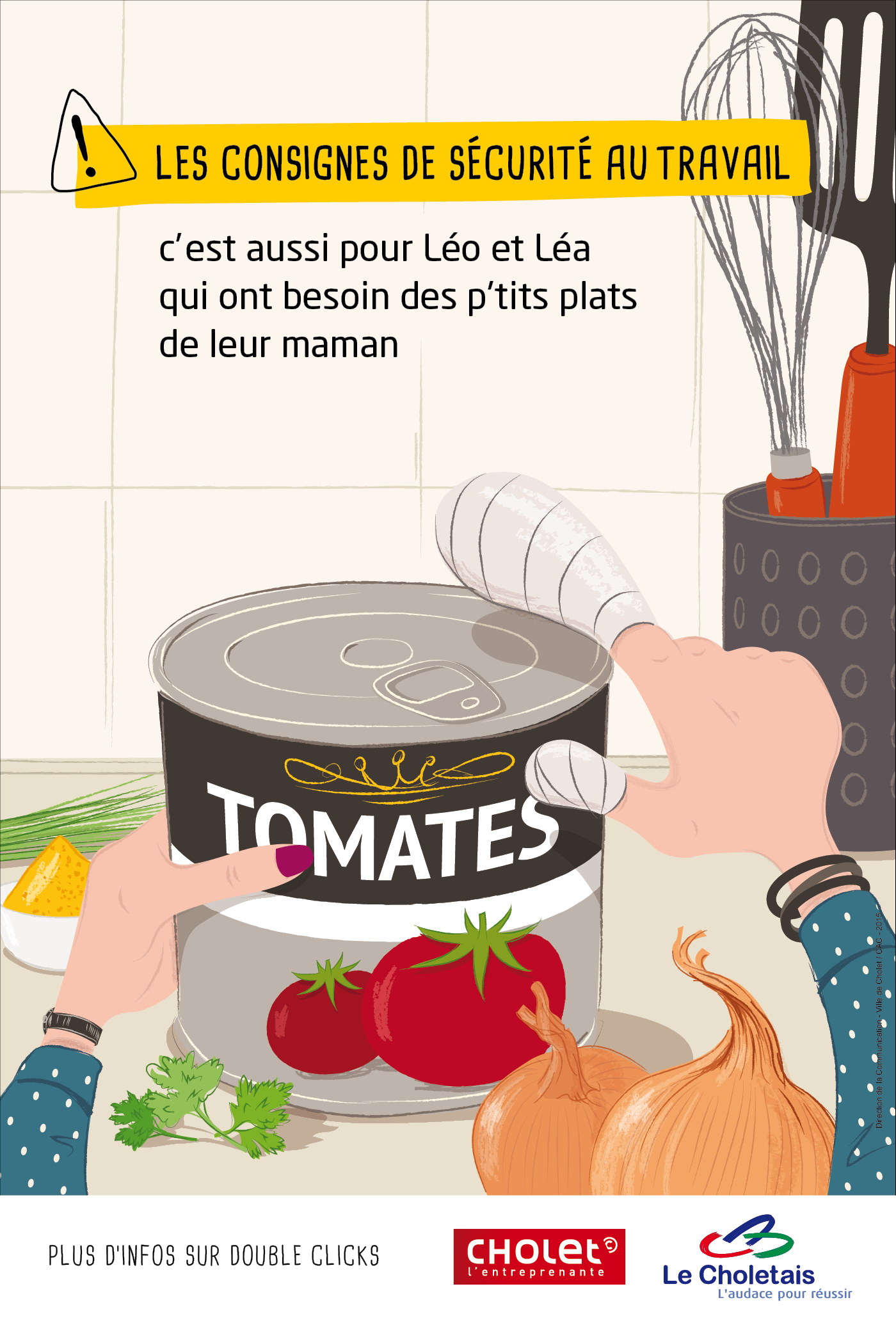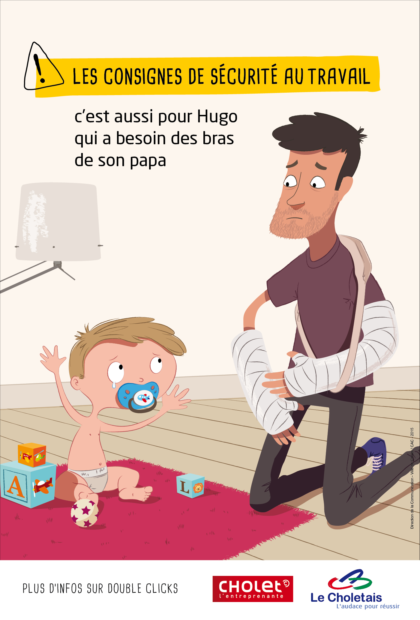 « Un bobo occasionné au travail, c’est un bobo qu’on ramène à la maison, avec un impact sur sa vie de famille et sa vie privée ». Pour son plan de prévention des risques au travail, la ville de Cholet fait le choix d’un message qui fait réfléchir aux conséquences de la prise de risque, au delà du cadre strictement professionnel. Une campagne simple, astucieuse et efficace.