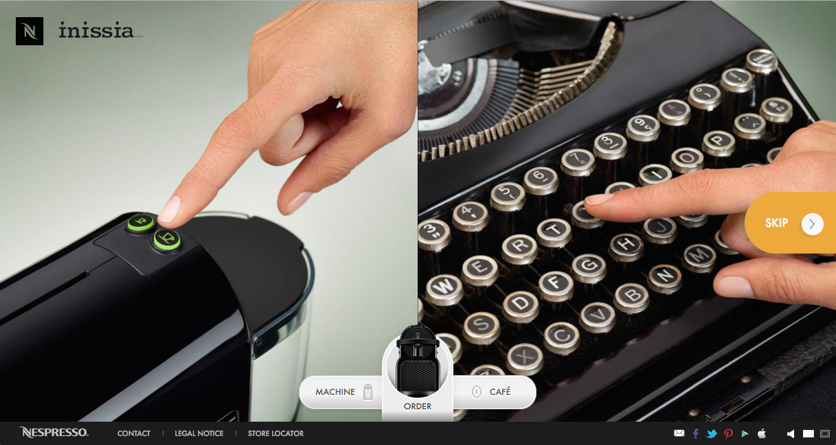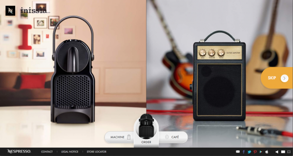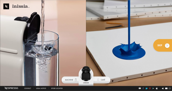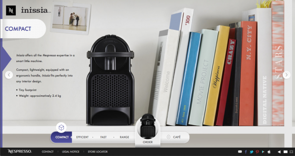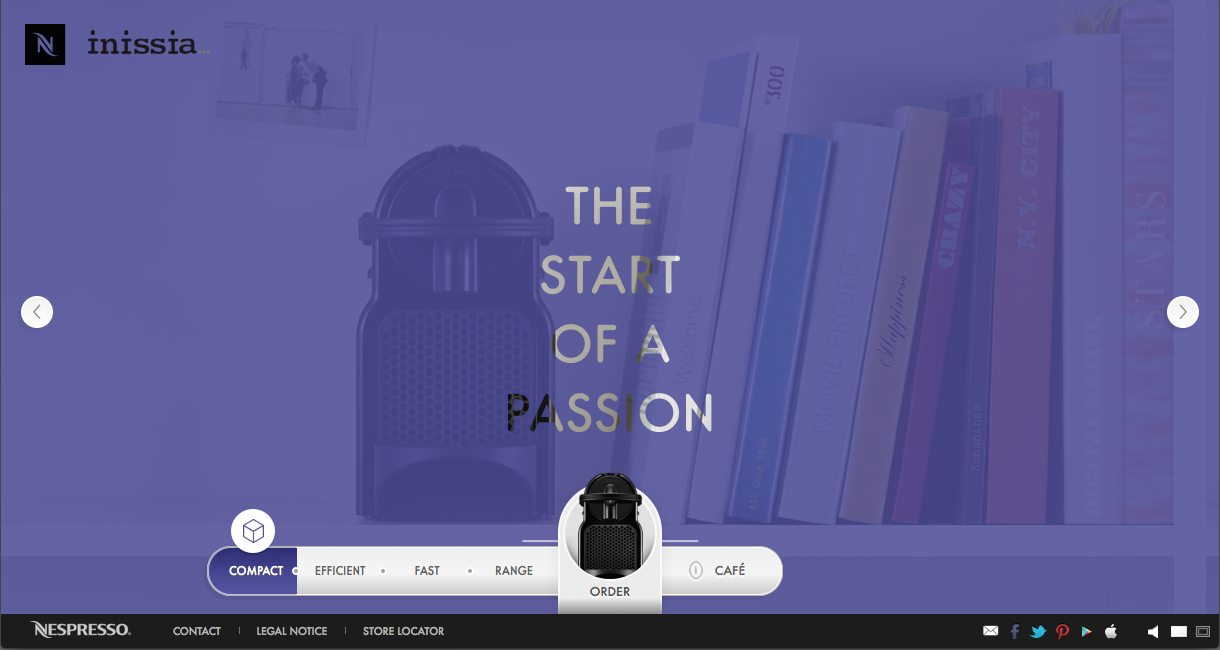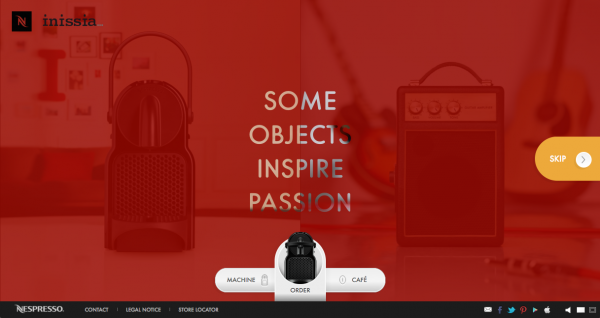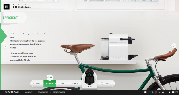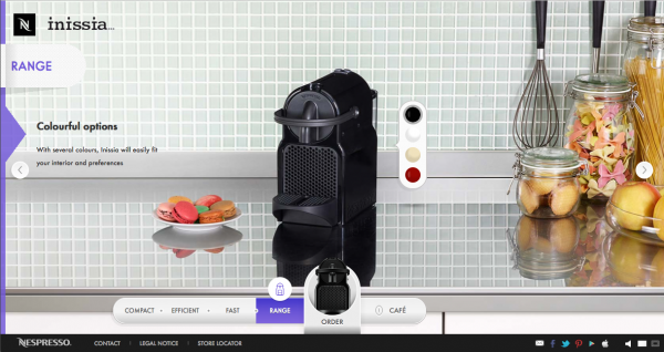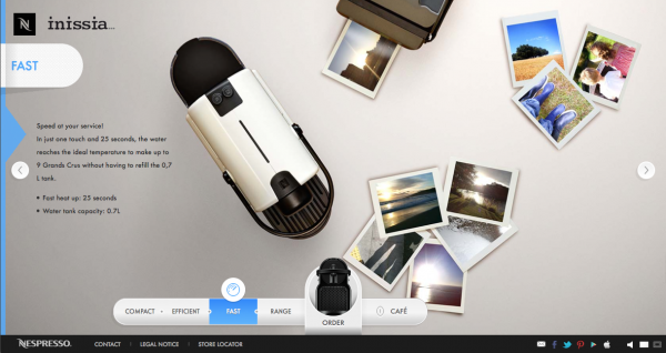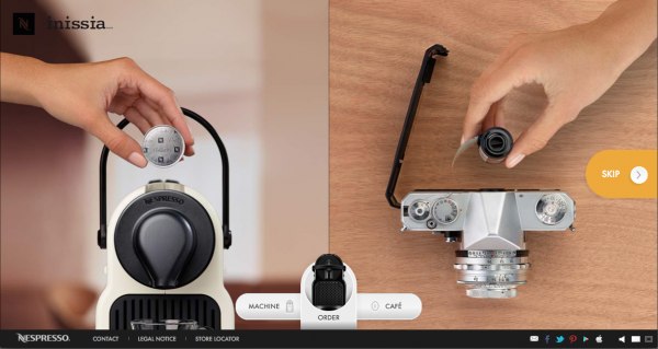 Le site présente les analogies de gestes et de visuels coexistants entre la manipulation d’un objet passion et la préparation d’un café Nespresso avec la machine Inissia.